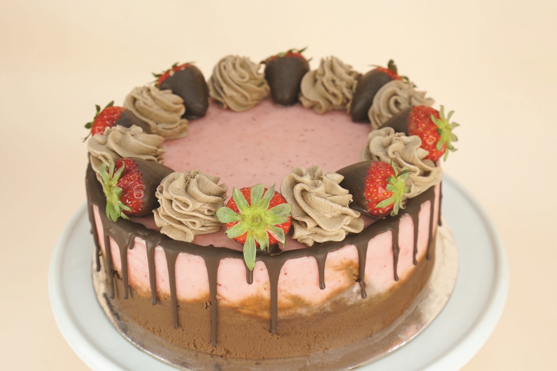 A vegan friendly, 95% sugar reduced Chocolate and Strawberry gelato topped with chocolate buttercream and strawberries.